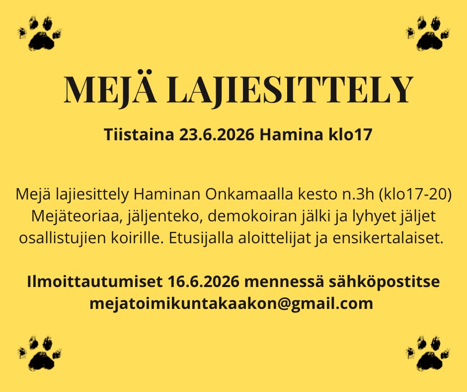 Mejä lajiesittely Haminan Onkamaalla kesto n.3h (klo17-20) Mejäteoriaa, jäljenteko, demokoiran jälki ja lyhyet jäljet osallistujien koirille. Etusijalla aloittelijat ja ensikertalaiset.